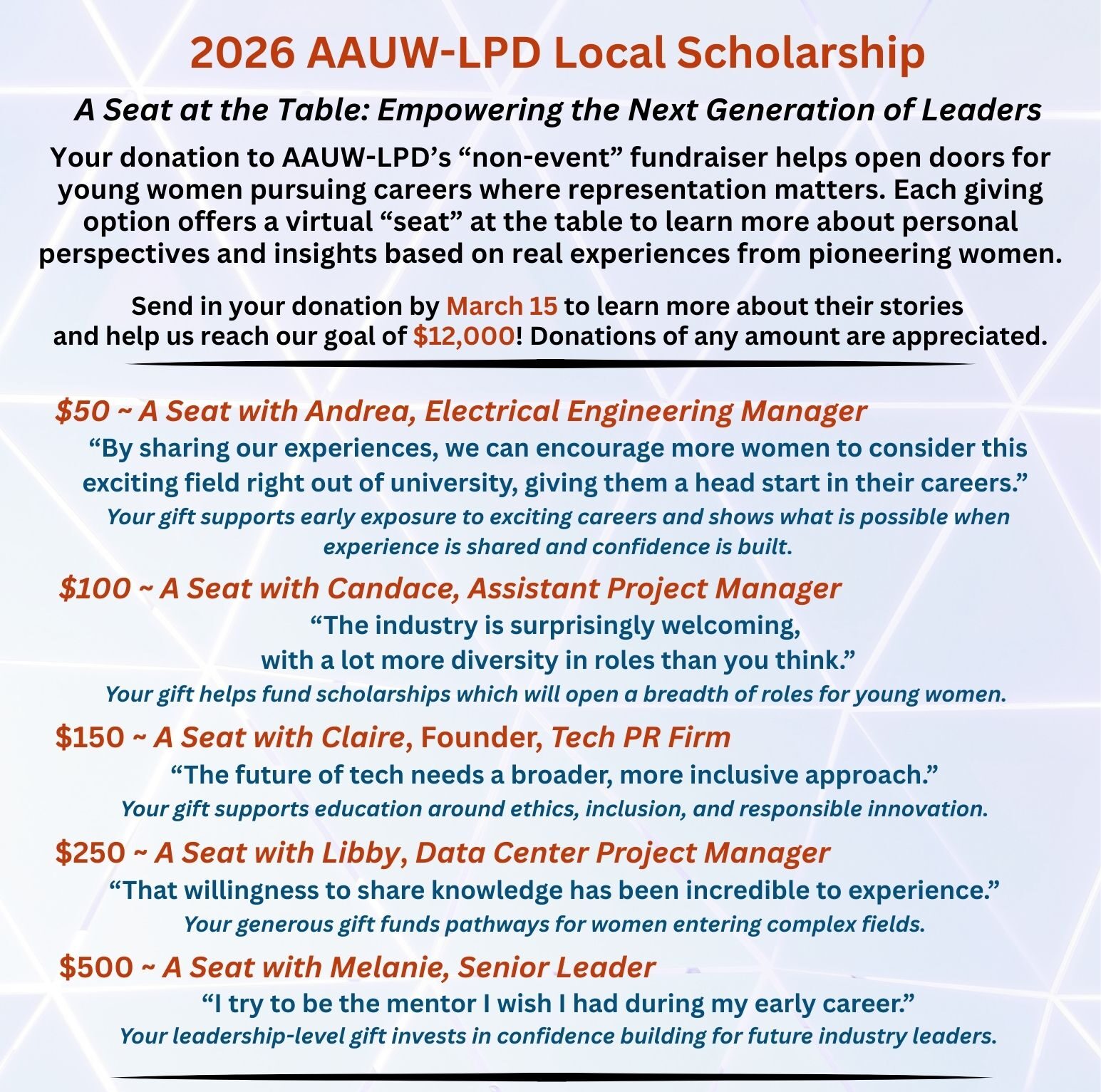 Your local AAUW Foundation Board is excited to announce the kick-off of our 2026 annual Local Scholarship “Non-Event” Fundraiser! This no-fuss fundraiser gives our members and others the opportunity to donate to an excellent cause without purchasing a ticket, buying a product, or leaving your home.